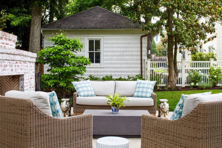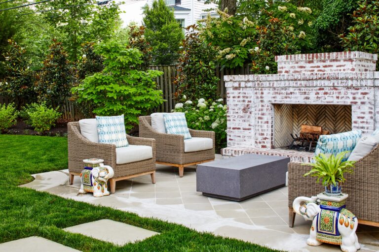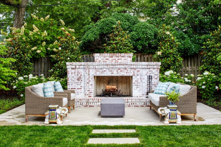 A seating destination was created at the back of the garden with a limestone terrace and a large limewashed fireplace that will take on a nice patina over time. Handsome split herringbone brick lines the firebox. Two flowering dogwoods flank either side of the terrace and pavers lead back to the dining porch. The fireplace terrace is the focal point of the rear yard and has a lovely view of the house. A huge existing Japanese Maple was retained and is beautifully up-lit in the evenings, magically illuminating the whole yard.