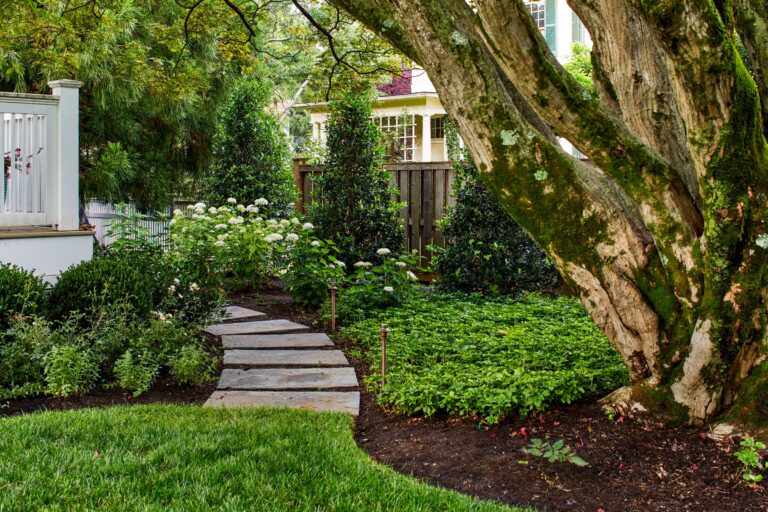 The scope was relatively simple, no retaining walls were needed for example, but everything in the front yard was newly organized and planted, including the allée of flowering magnolias to the left of the driveway. For this commission, the design team focused on the front yard, improving the drive, which is shared by the neighboring house, and the back garden. Turning the corner from the rear, a small secret garden of liriope and hydrangea planted beneath a canopy tree is discovered via steppingstones. Reclaimed brick walkways and Indiana limestone pavers unify the plan.
