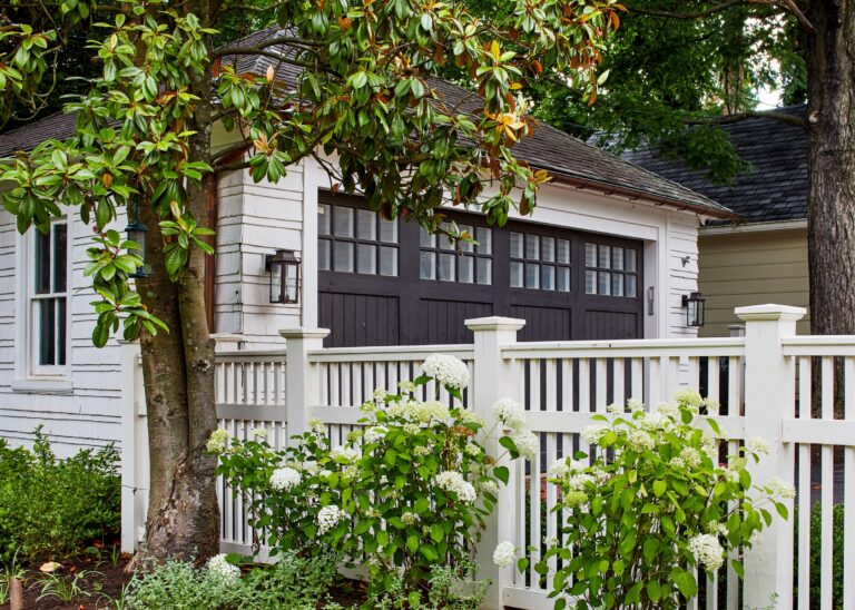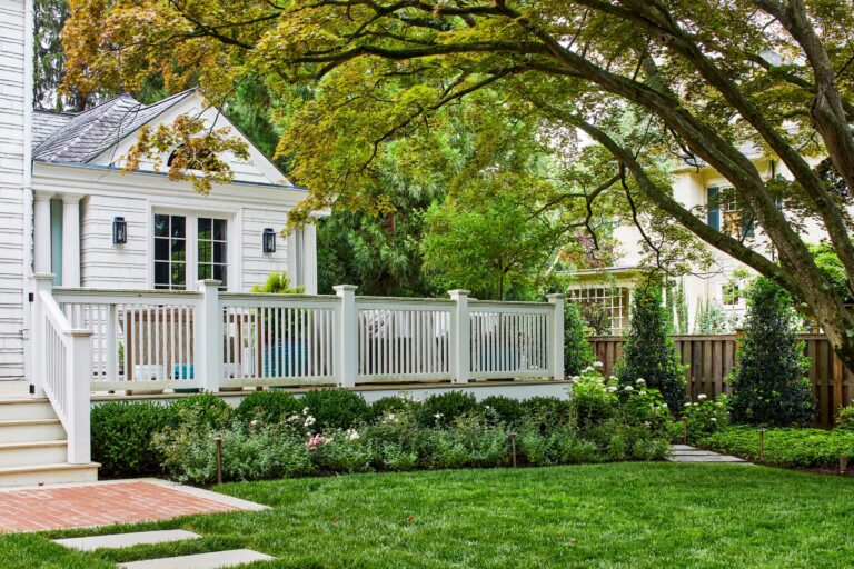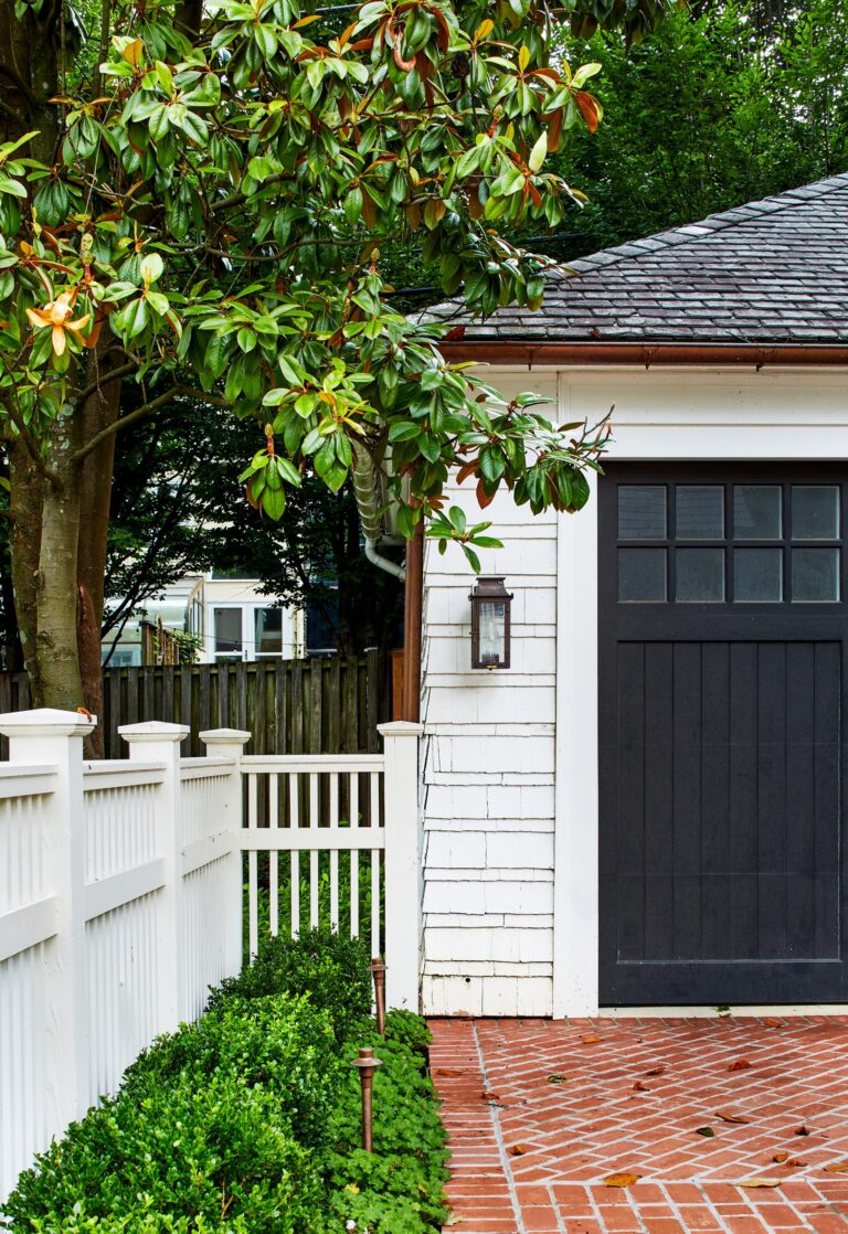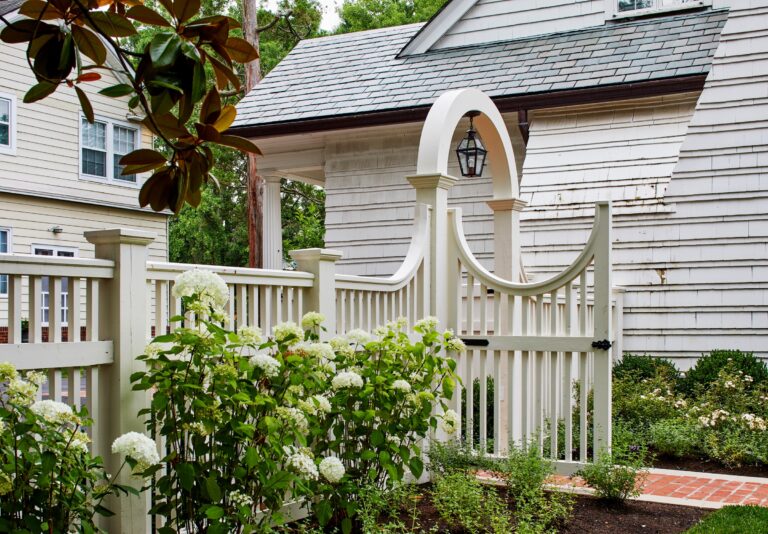 At the front, the picturesque, park-like setting of the district inspired traditional rows of boxwood layered with hydrangea, roses, nepeta, and magnolias. At the driveway side, the pretty existing fencing, gate, and arbor were restored and relocated to clearly mark the drive entrance and open into the rear garden. Striking Bevolo copper lanterns and a brick path guide the way. The owner has a space for his outdoor kitchen just past the gate.