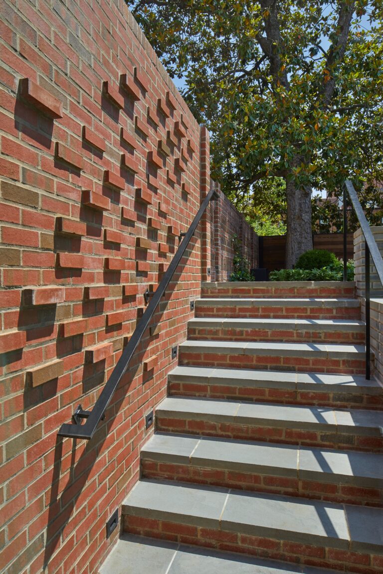While the small space had limitations, the design team relished the task. The brick pattern set in the wall, a custom handrail, the green roof above the lower-level conference room, and the large planter that doubles as a compact bio-retention system contributes to the client’s requirements for the space to be beautiful and eco-sufficient. Plant materials include an existing Southern Magnolia, which was carefully protected during construction. Green Mountain Box, Francee hostas, delicate ferns, English Ivy, and grasses contrast the orderliness of the brick walls and Pennsylvania blue flagstone pavers. A small Beni Kawa (acer palmatum) Japanese Maple has salmon-colored bark that sets off changing leaf color. After its leaves drop the bark becomes orange for a lovely bit of color during the winter months.