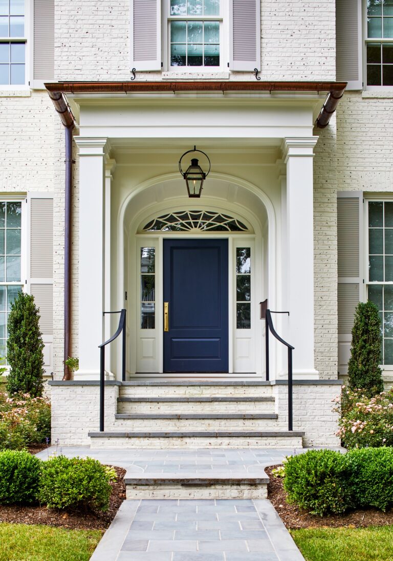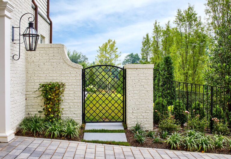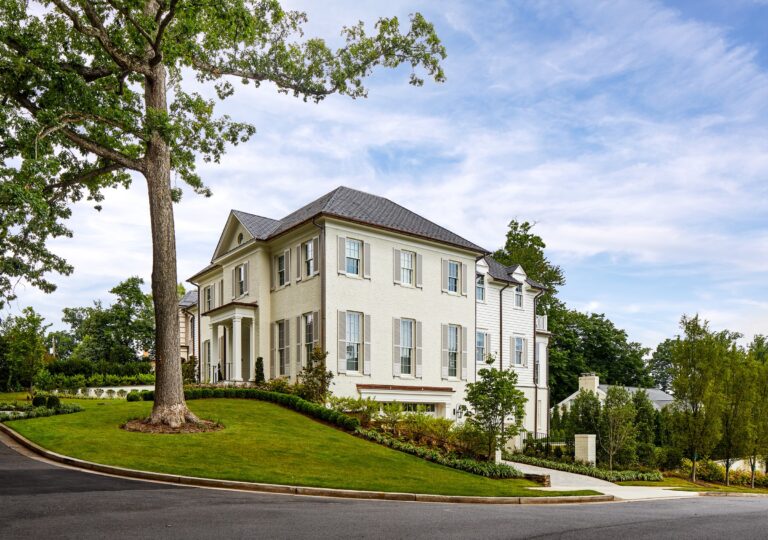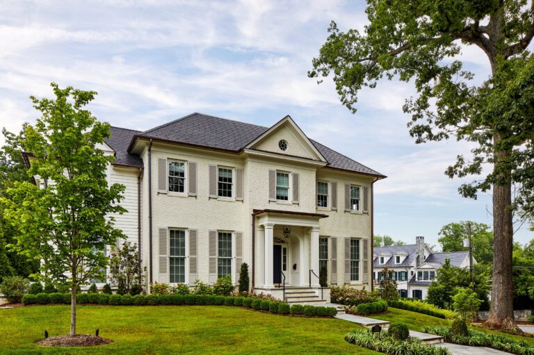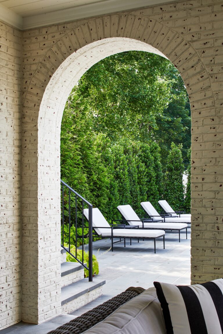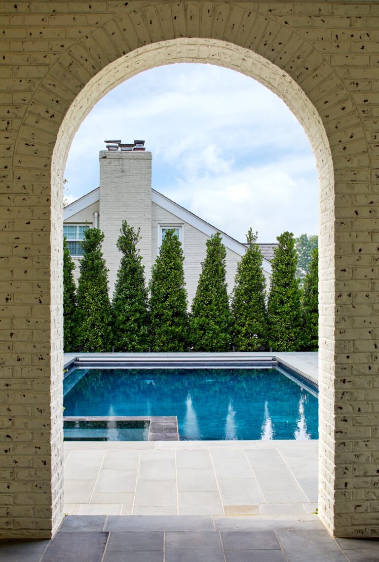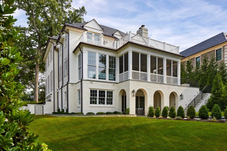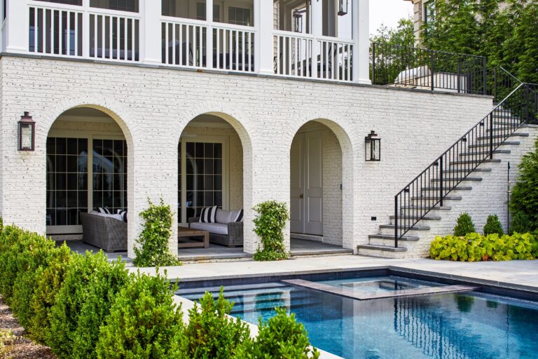 Our clients envisioned a new custom residence and garden as a forever home to grow into. The existing house was torn down to make way for a large villa designed by GTM Architects of Bethesda. For the exterior, the owners requested a perfectly manicured landscape, a pool and terrace, entertaining space, and room for kids to play. The house emanates a traditional formality so Boxwood, roses, magnolia, and hydrangea make up the plantings at the front, setting off the house and the large existing mature oak tree. English Ivy climbs cable trellises to soften and green up the walls and archways.