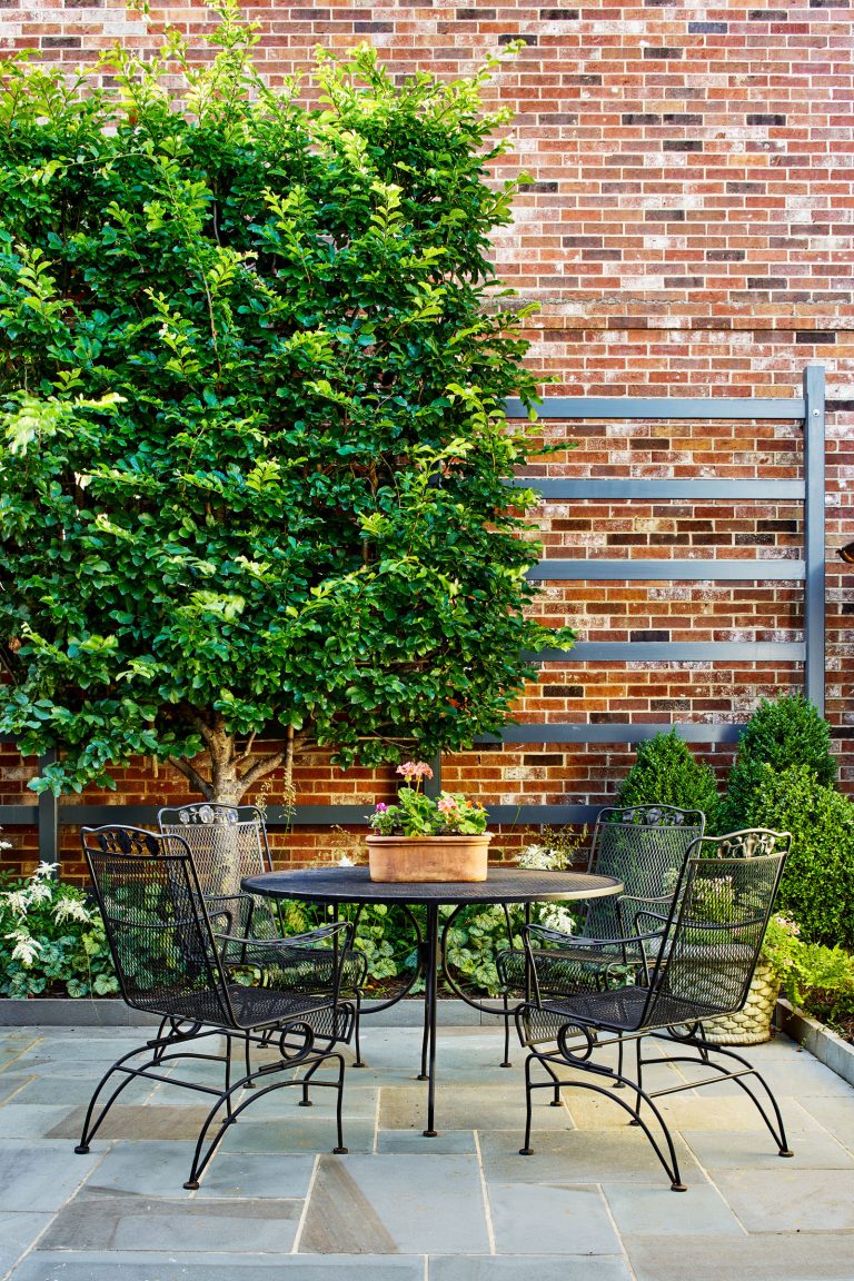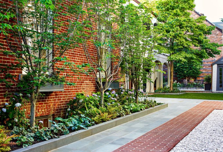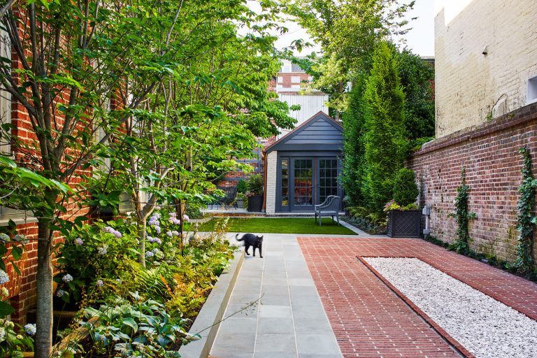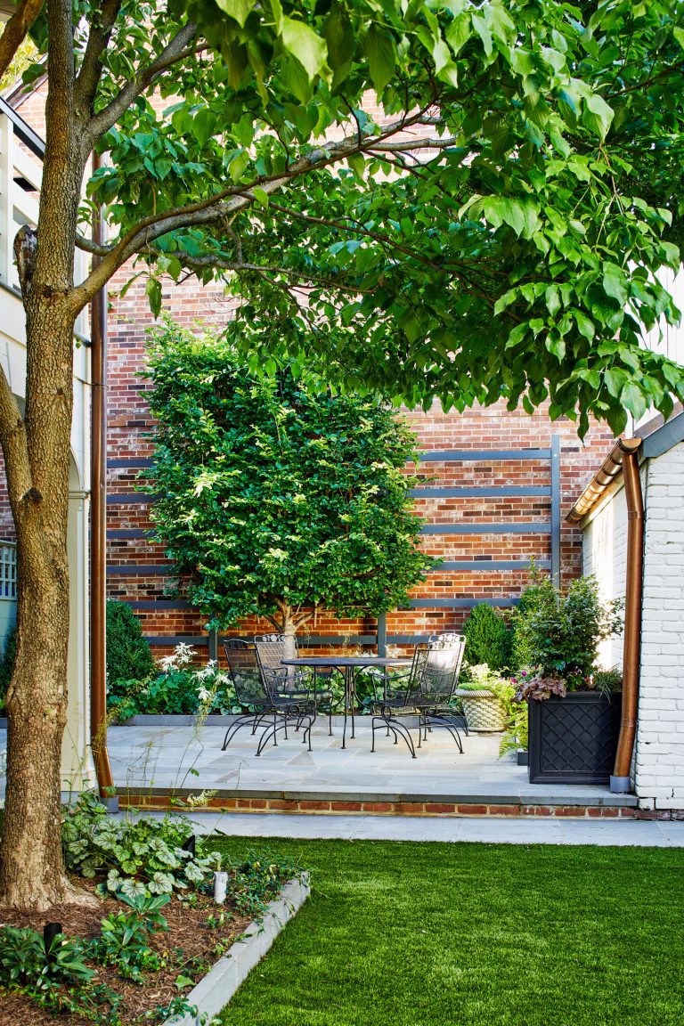 For the courtyard landscape that wraps behind the house from the side drive, Richardson & Associates created a linear garden designed to accommodate an area for the tenants to enjoy, turf for dogs and kids, and the ability to utilize all the outdoor spaces for entertaining groups of up to 100 or 200 people. At the back, a painted Accoya wood trellis supports a one-of-a-kind Parrotia tree, which is espaliered and will provide changing seasonal color against the brick of the adjacent building. The mint green gate leads to a garbage and recycling enclosure and takes its design cues from the historic home.