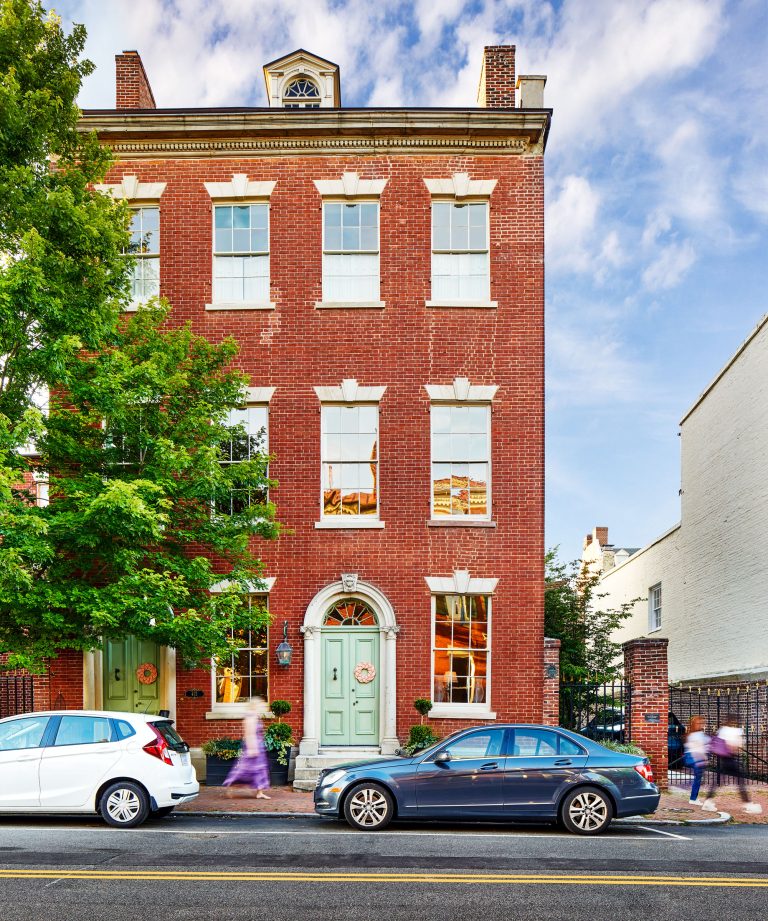 The client, a historic preservationist, had always admired this double-entry townhouse in Old Town, Alexandria. After purchasing the property, the eighteenth-century structure and carriage house were completely restored inside and out by its new owners. The family lives in one half of the building and rents four apartments created in the other.