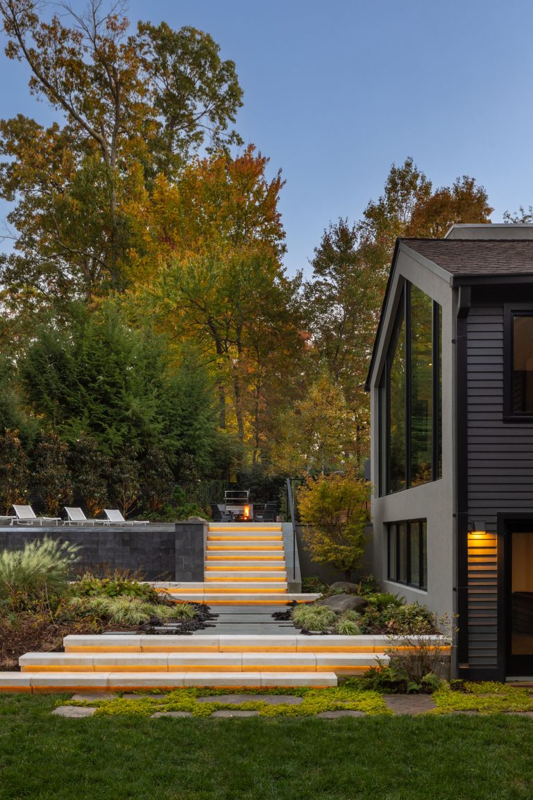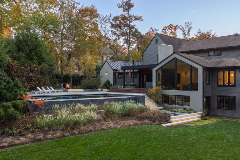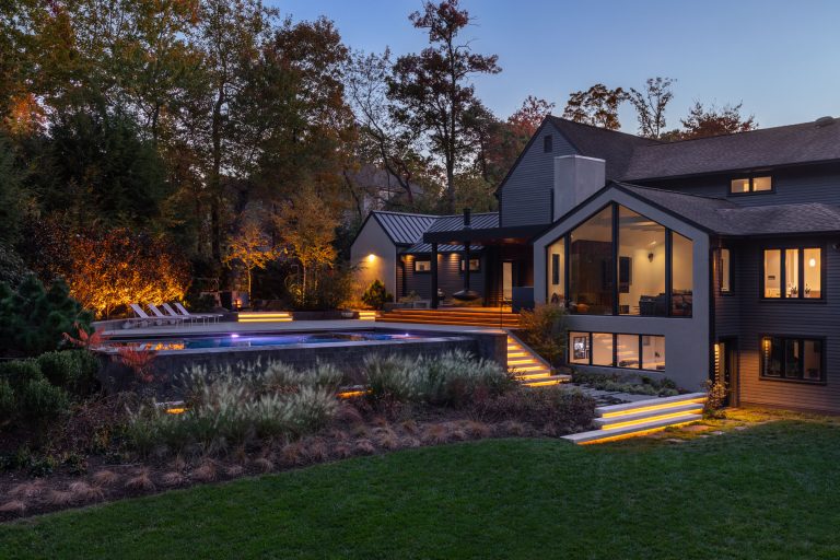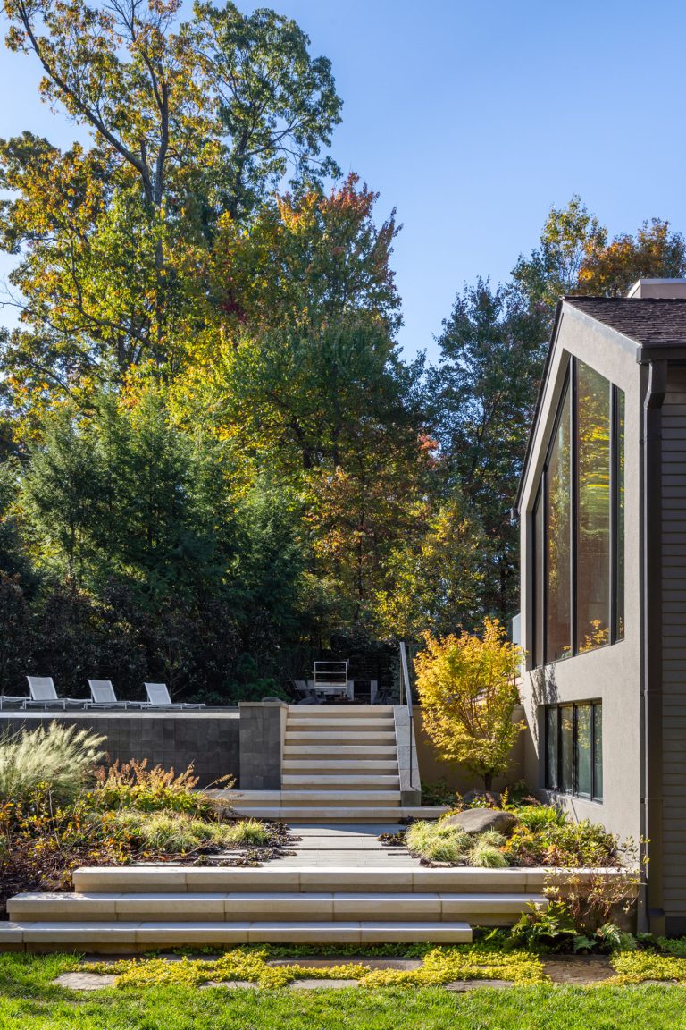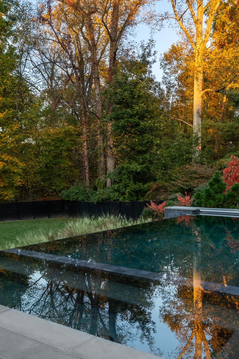 The owner of this home in McLean, Virginia, has made meticulous architectural improvements to the existing structure over the years. Changes to the back elevation replaced small 1980s windows with broad glazing to bring in light and the view, which inspired him to replace the extant boulder garden with an infinity pool, dining patio, and newly planted landscape. To complete the owner’s vision, Richardson & Associates created a scheme inspired by Mid-Century design. The resulting lines and edges of the pool, terrace, dining patio, and steps extend the horizontality of the house into the land.