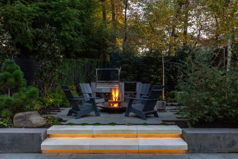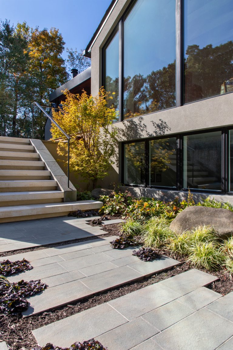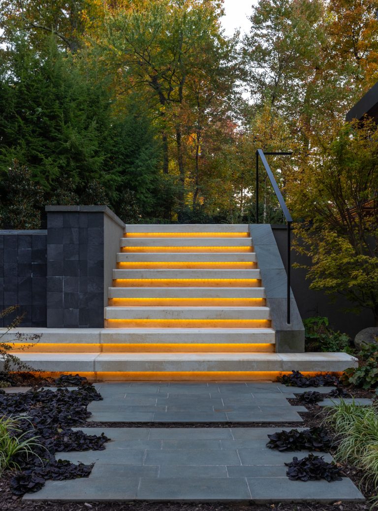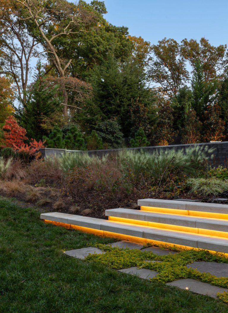 The owner of this home in McLean, Virginia, has made meticulous architectural improvements to the existing structure over the years. Changes to the back elevation replaced small 1980s windows with broad glazing to bring in light and the view, which inspired him to replace the extant boulder garden with an infinity pool, dining patio, and newly planted landscape. To complete the owner’s vision, Richardson & Associates created a scheme inspired by Mid-Century design. The resulting lines and edges of the pool, terrace, dining patio, and steps extend the horizontality of the house into the land.