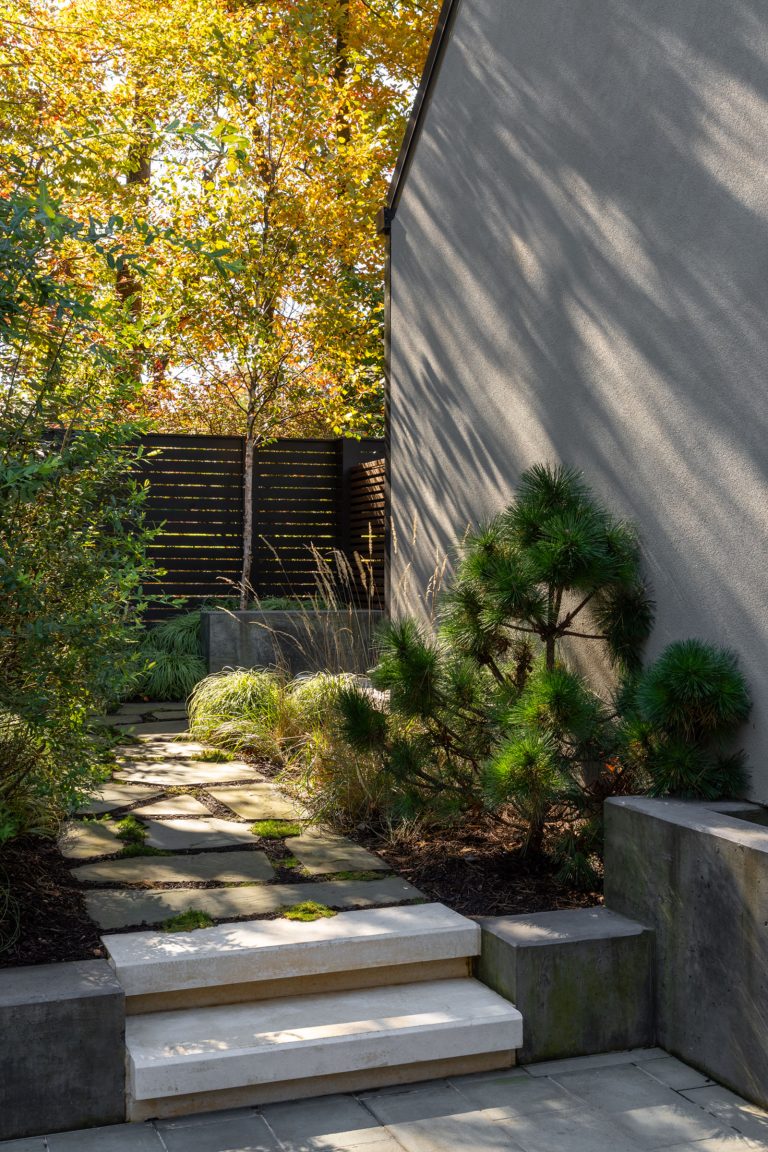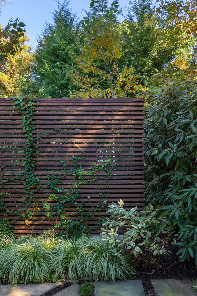 In contrast to the geometric hardscape and black-painted perimeter fence, custom Ipe screens, monolithic poured concrete benches, and cast concrete steps, the garden is dynamic and loose. The plant pallet includes nearly 50 species, many of them native. Thickly planted, evergreens and grasses coexist in textured swaths, groupings punctuated by variegated leaf dogwood, white birches, Tiger Eye Sumac, a native Sourwood, and Witch Alder. The gray/black interior of the pool permits an expansive, reflective quality; quietly dramatic but not stark.