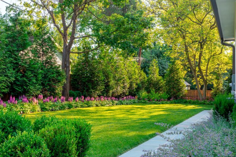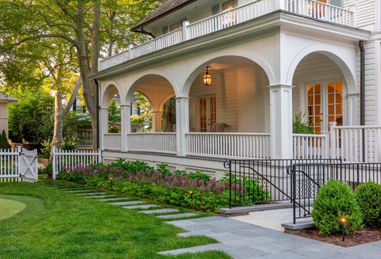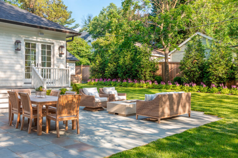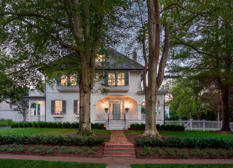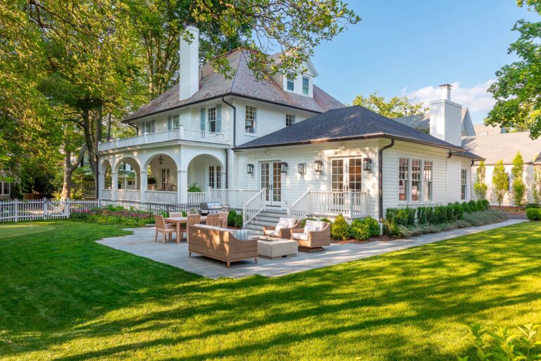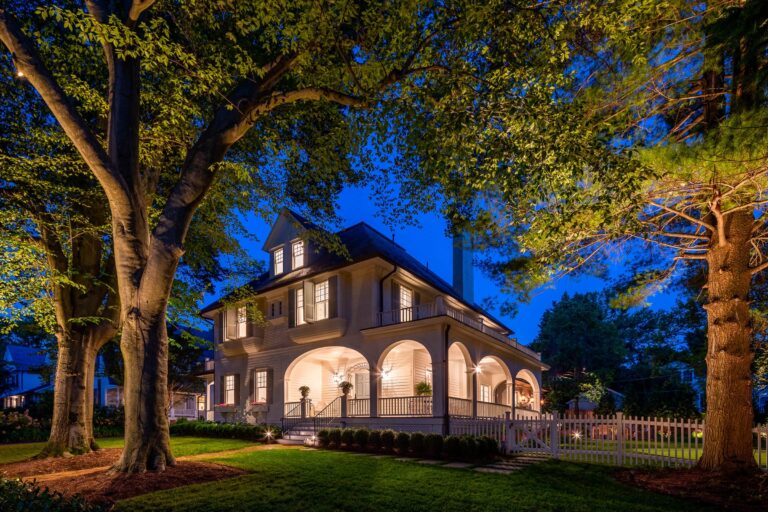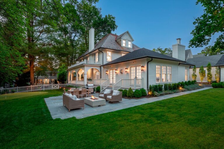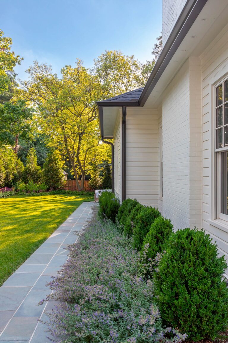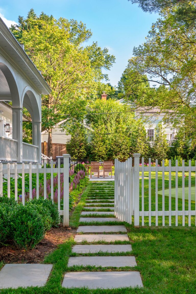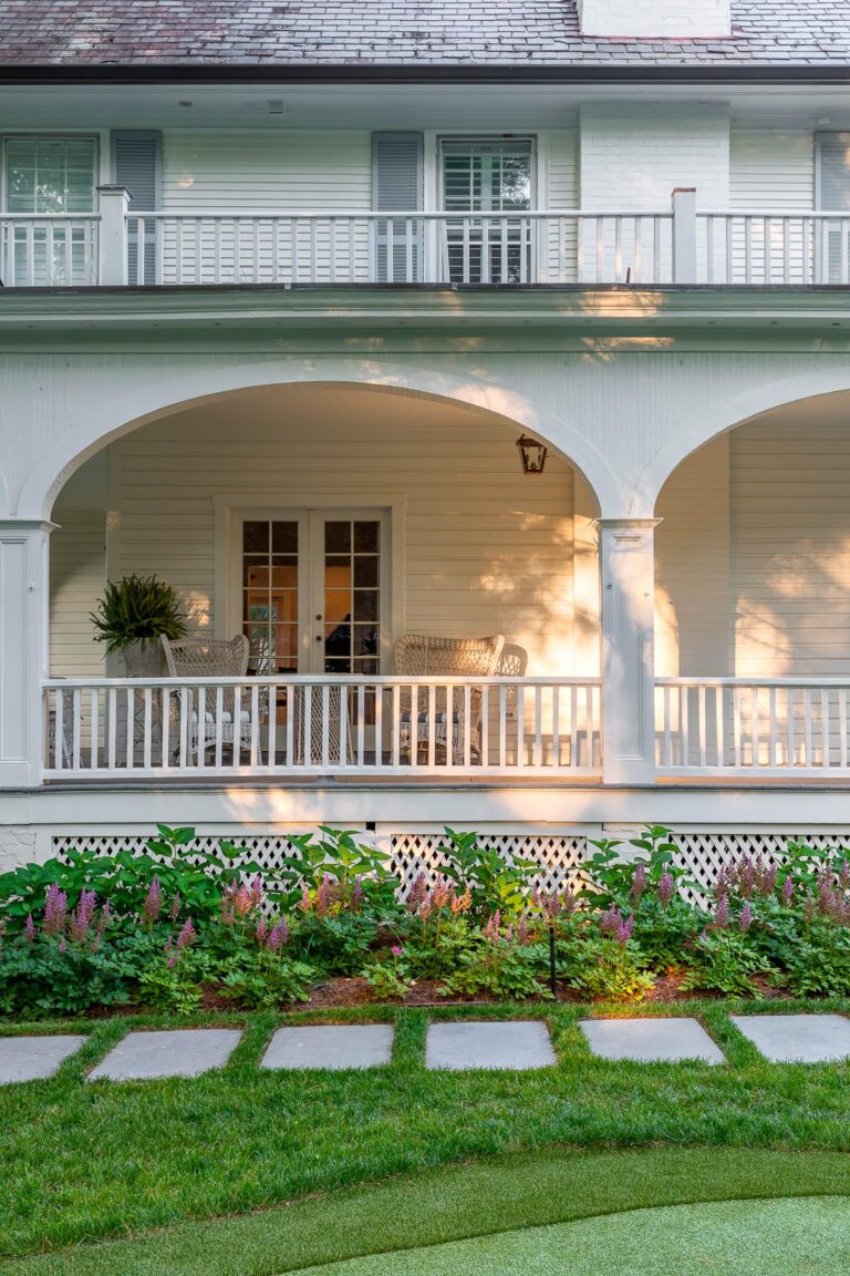From the front porch, a pathway of stone bands leads to the picket gate and into the private, rear garden. Screening evergreens, hydrangeas, and massings of blush-colored astilbe, cat mint, yews, and boxwood define the edges along the putting green, a cooking/dining patio, a lounge area with the fire table, and a swath of lawn. The landscape lighting plan emphasizes the uplighting of majestic trees and moonlights the ground plane, which creates welcoming outdoor rooms long past sundown. Of interest perhaps, is what is not visible. Stormwater management dictated the placement of all elements and required a balance of environmental sensitivity and design ingenuity.