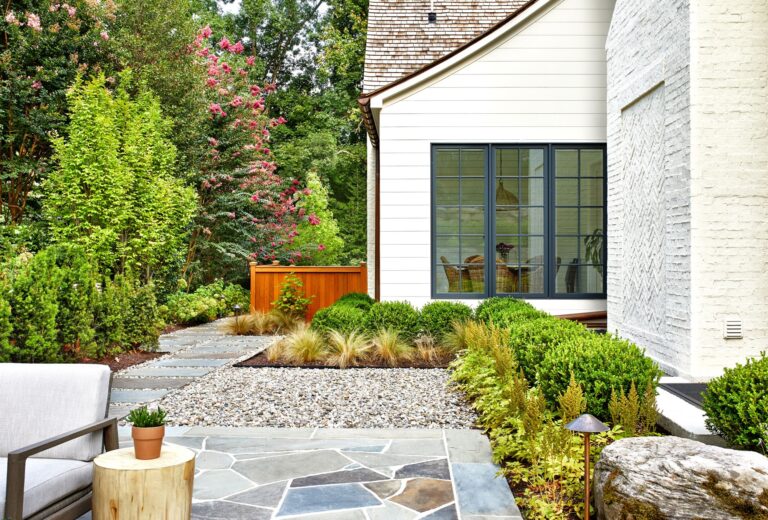 The integration of classical garden elements with a looser, but no less specific approach addresses the husband and wife’s different design sensibilities. The entry garden pairs formal shapes with low plantings and perennial flowers. At the rear, traditional dry stack retaining walls surrounding the entertaining area appear beautifully contemporary in their expression. Two patios — one for cooking and dining, the other for repose around a fireplace — are connected via a walkway of pavers surrounded by river stone, which in turn are bordered by traditional boxwood, boulders, ornamental grasses, and perennial flowers. To reinforce the inside/outside connection, an axial path of stone in a running bond leads from the front door through the house to culminate in the back garden. Upon arriving at the terrace stair, the stone path gives way to an irregular pattern that defines the patio areas.