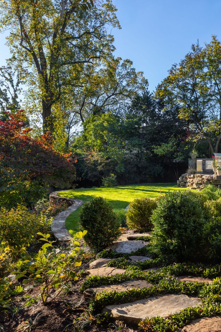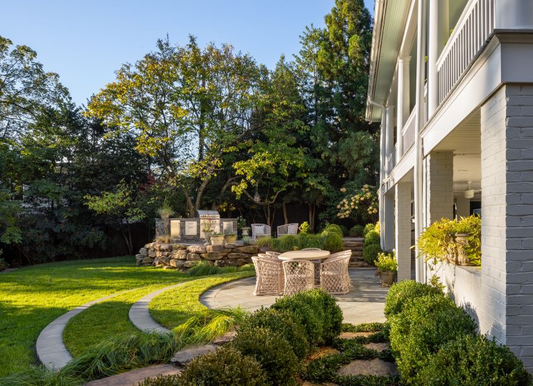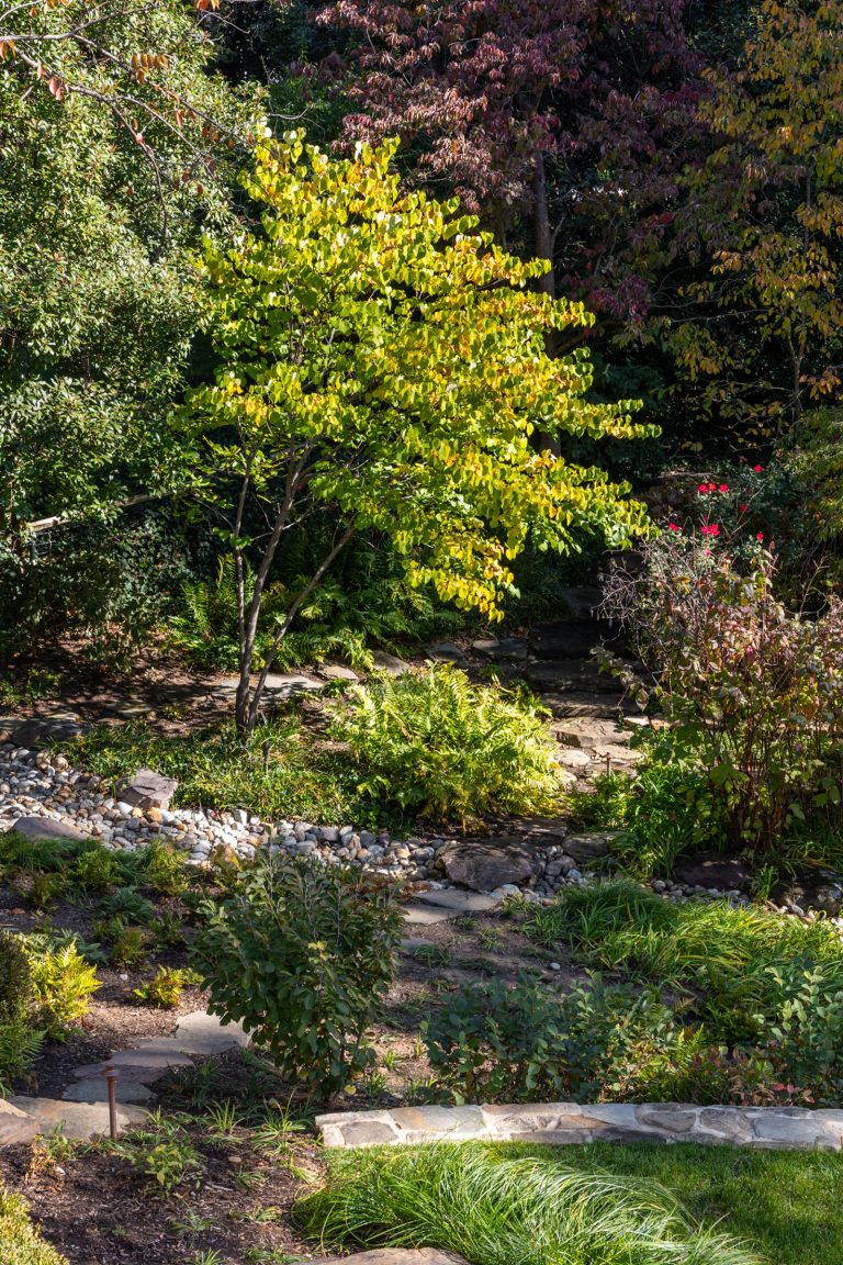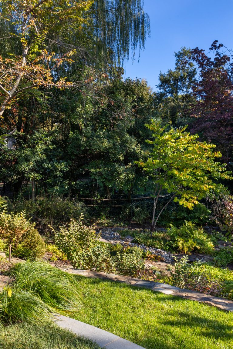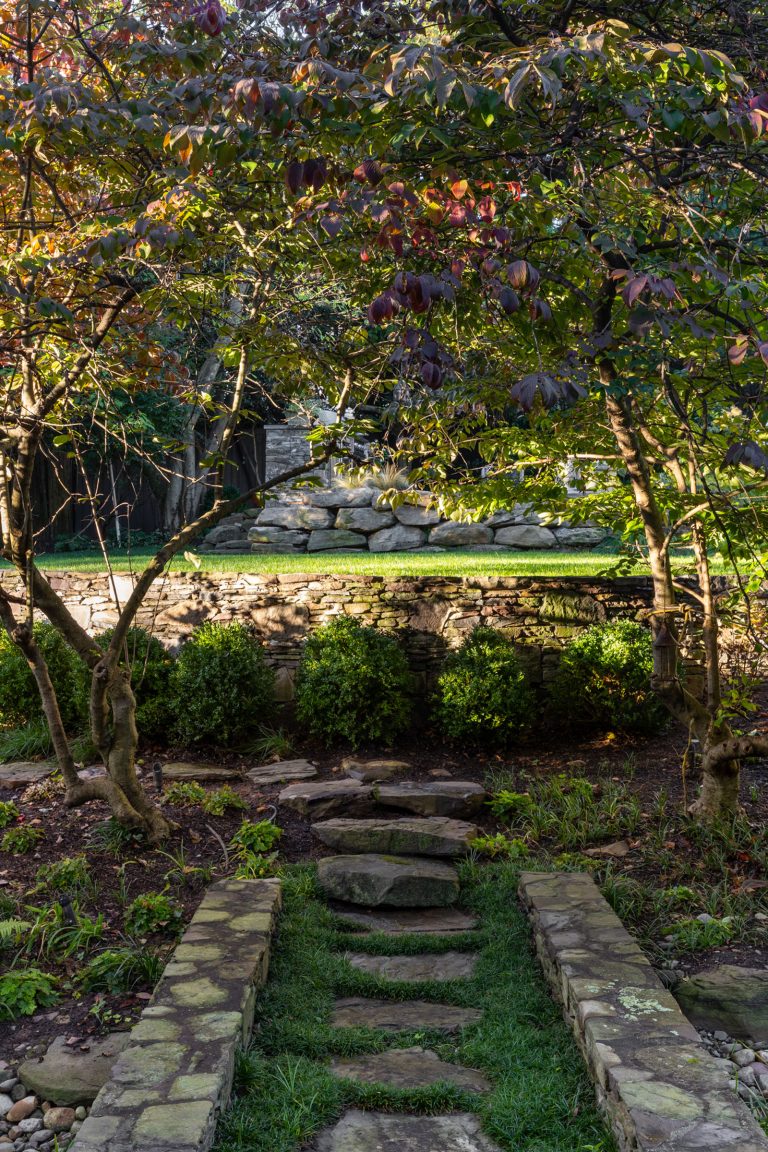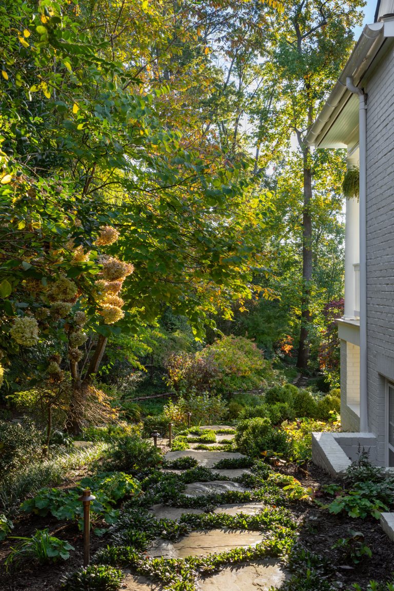 Comprised of a steep grade divided by a creek, a three-level garden flows from the rear elevation of the home, which permits views from a roof terrace, a wrap-around porch on the main living area, and a ground-level, semi-circular dining/entertaining patio. Boxwood, fothergilla, hydrangea, and liriope fill the beds and add a cultivated texture to existing native trees and shrubs. The cooking area rises above an elegant lawn terrace, which is encircled by a serpentine retaining wall. Below the wall, stone paths with grass or ajuga-filled joints circumnavigate through the lower woodland parts of the garden and up along the sides of the house. Distinctive but discreet lighting shows the way.