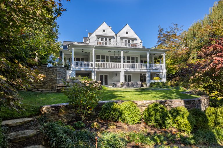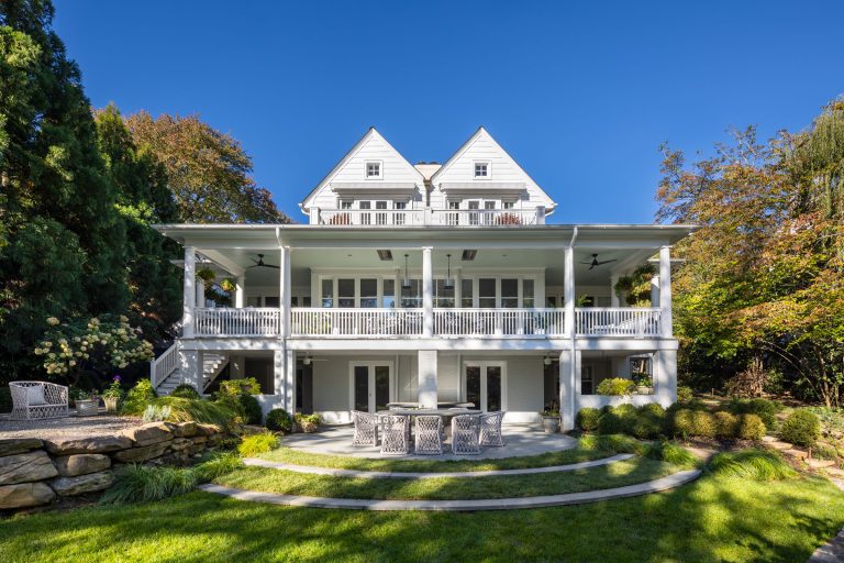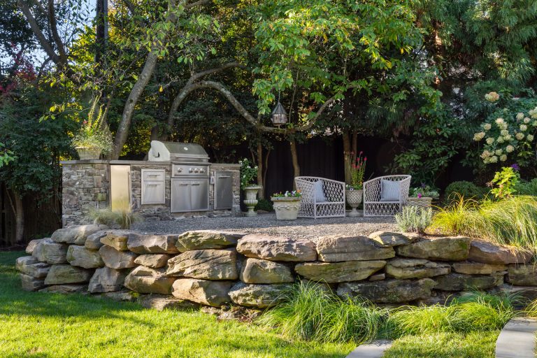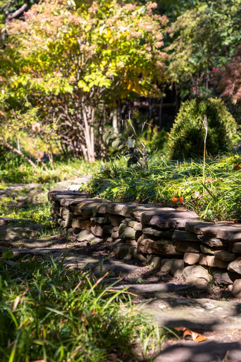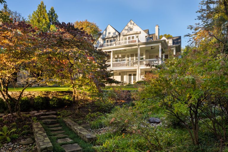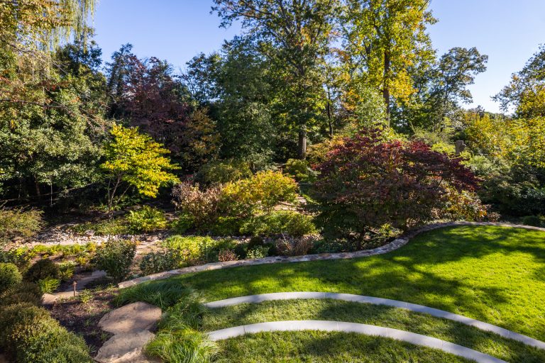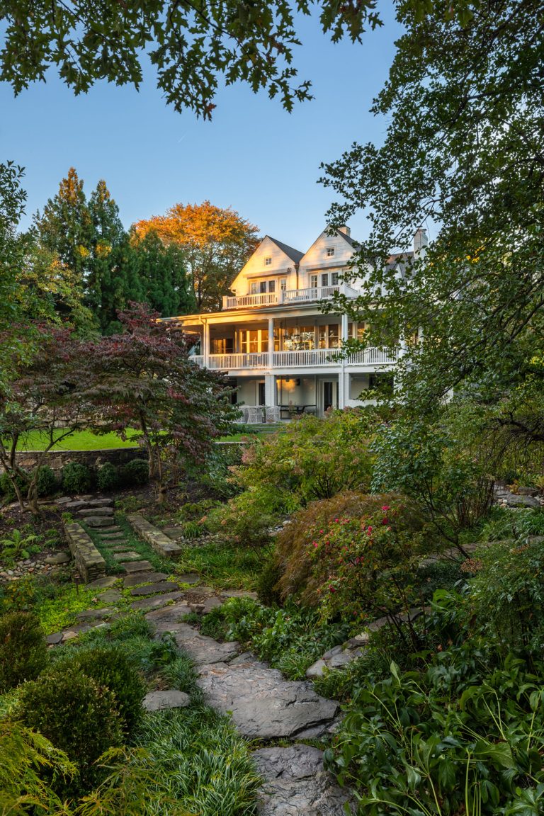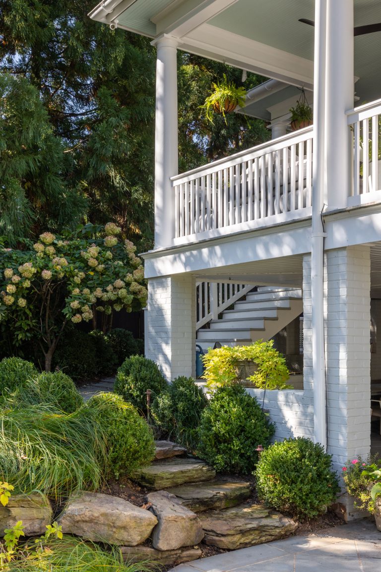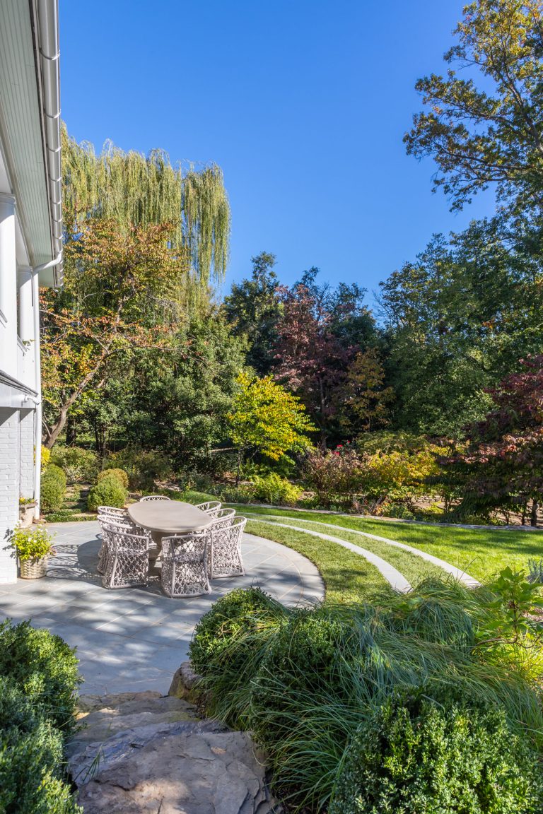 Comprised of a steep grade divided by a creek, a three-level garden flows from the rear elevation of the home, which permits views from a roof terrace, a wrap-around porch on the main living area, and a ground-level, semi-circular dining/entertaining patio. Boxwood, fothergilla, hydrangea, and liriope fill the beds and add a cultivated texture to existing native trees and shrubs. The cooking area rises above an elegant lawn terrace, which is encircled by a serpentine retaining wall. Below the wall, stone paths with grass or ajuga-filled joints circumnavigate through the lower woodland parts of the garden and up along the sides of the house. Distinctive but discreet lighting shows the way.