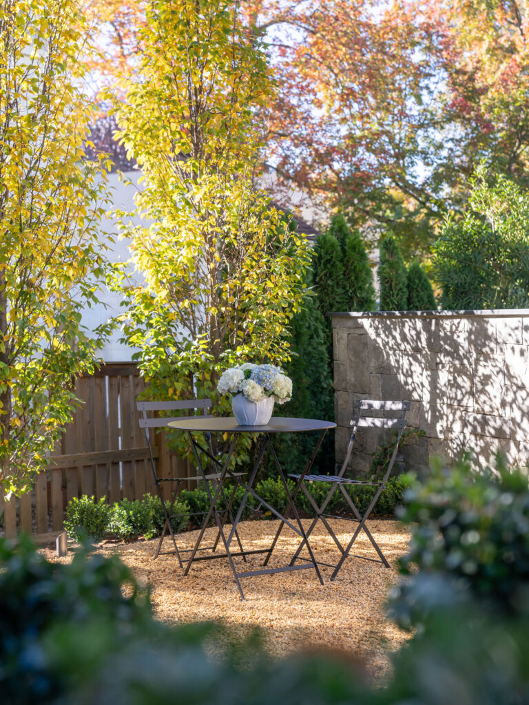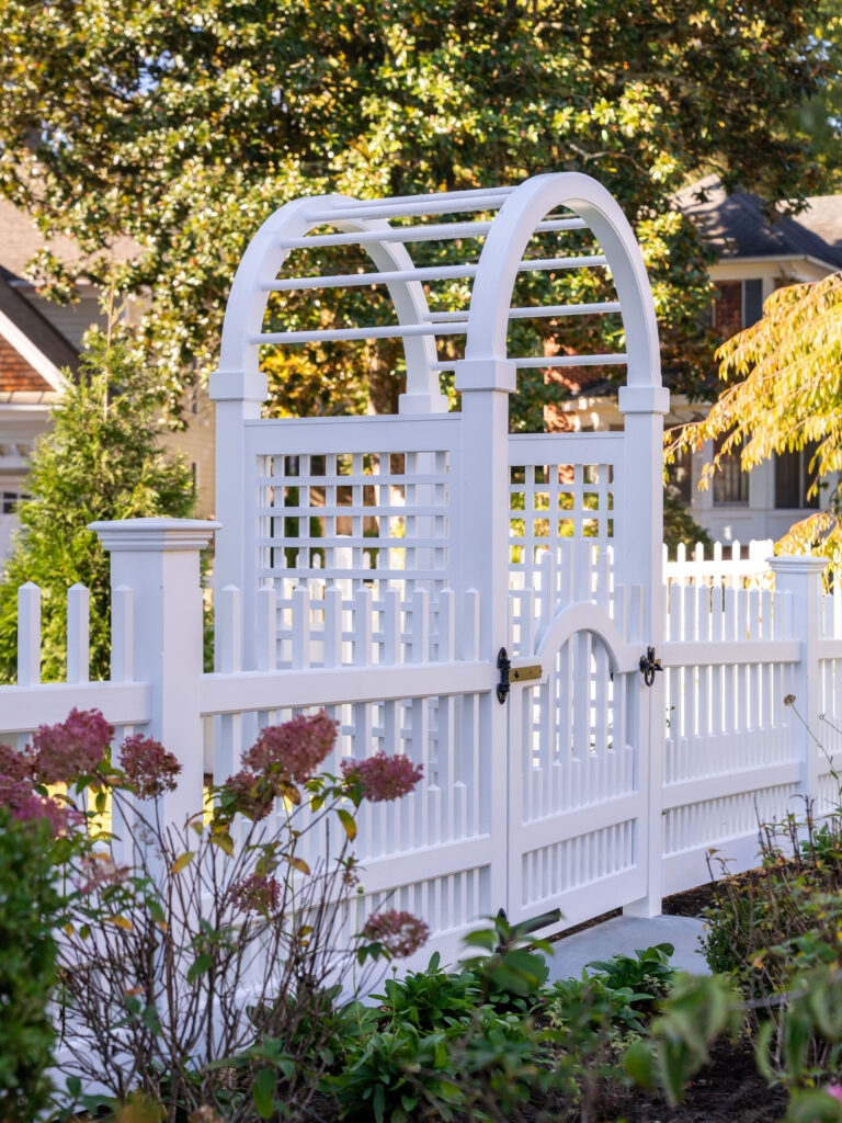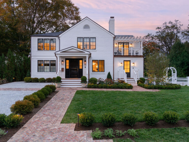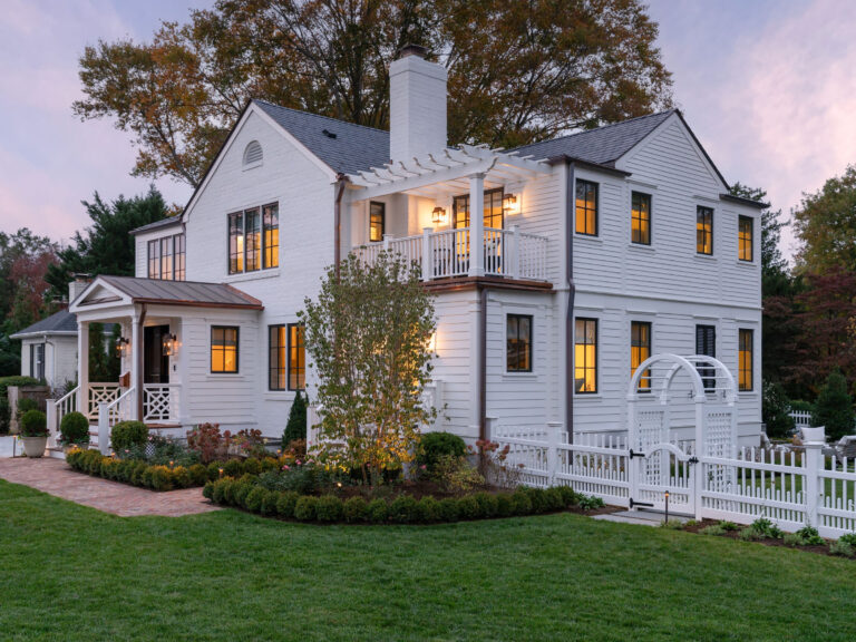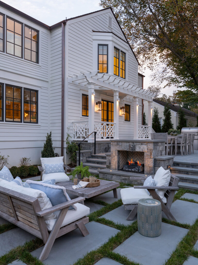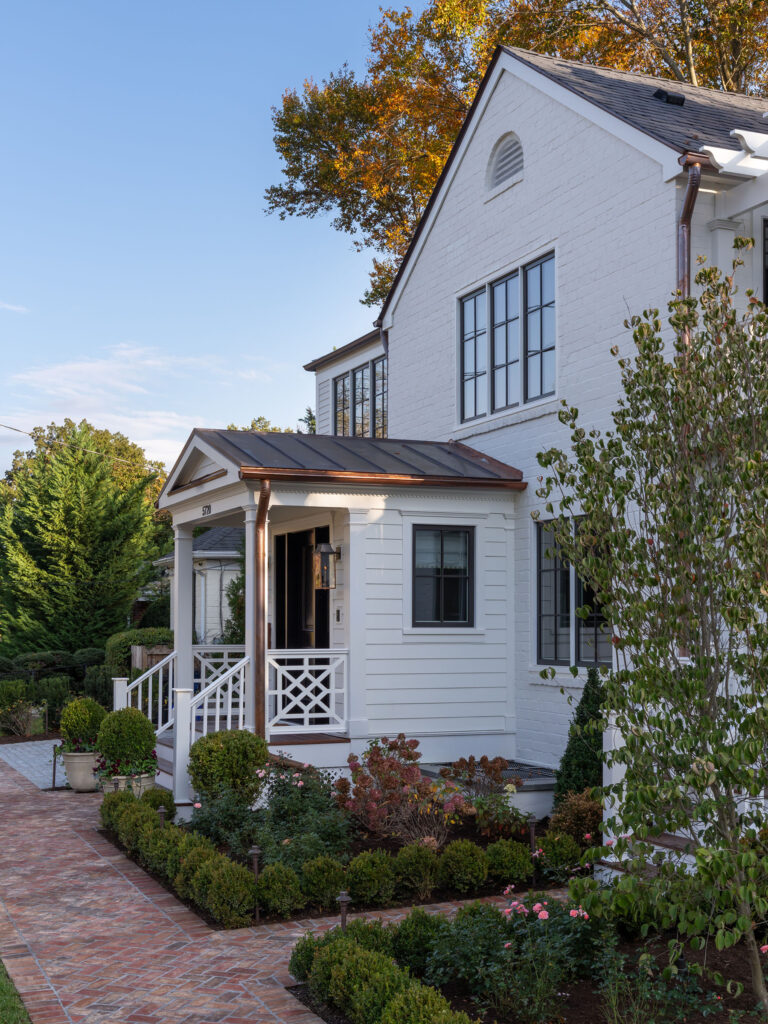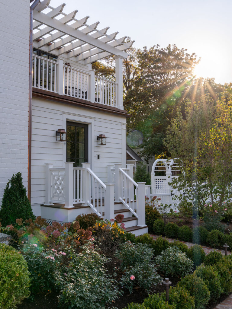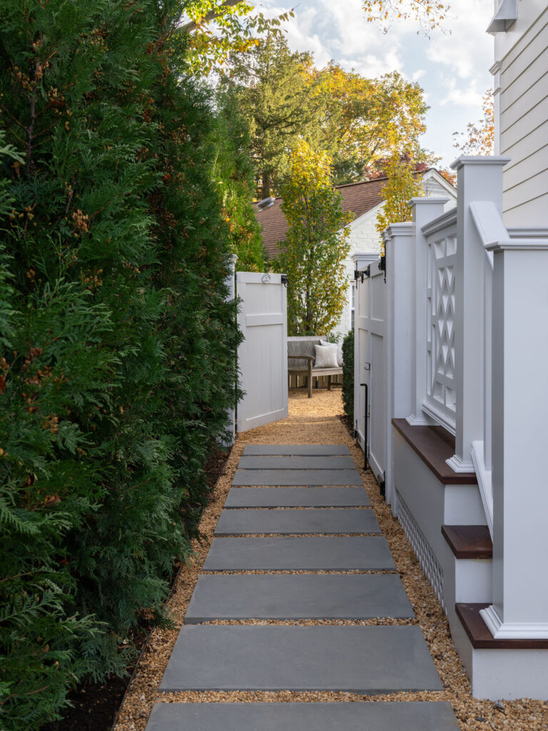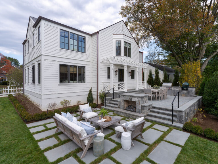 The clients, a young couple just starting their family, moved out of this house for a year during a complete gut renovation. They loved the house and location, an intimate neighborhood of Bethesda, MD, and envisioned a complete upgrade to the house, driveway, rear garden and side yard. Their inspiration was a New England-style cottage and garden with classic details and traditional plantings. Richardson & Associates integrated exterior refinements and materials that include whitewashed handmade brick from Old Carolina, cobblestones, and a picket fence and garden gate. The pergola will eventually support a wisteria vine on stainless steel cables. Zoning restrictions and the shallow back garden necessitated placement of the gas fireplace between the upper dining/outdoor kitchen terrace and lower lounge terrace. The fireplace required a specific scale to not overwhelm the limited space or house, and is comfortably integrated into the thermal bluestone of the upper terrace. The more spacious side yard will become the play area and is bordered by painted cedar fencing and box parterres.