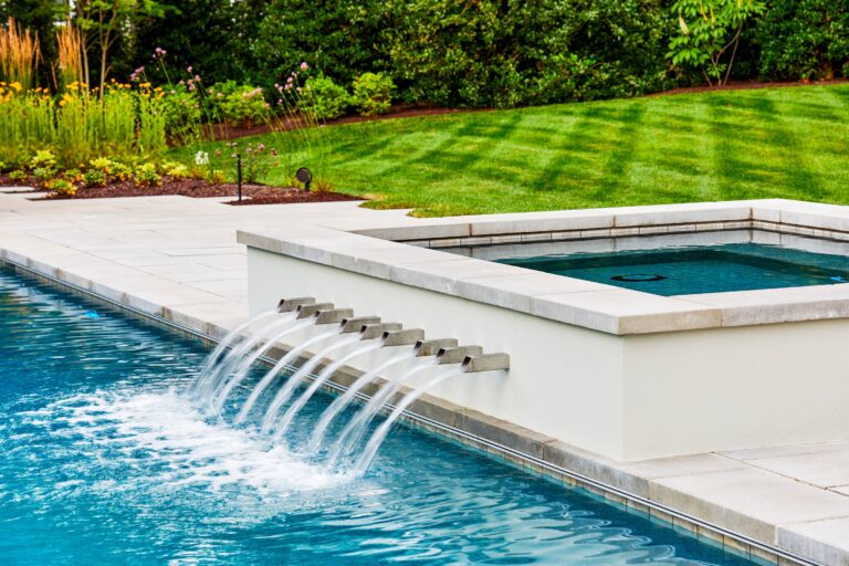 The project was constructed beginning with the rear yard, which includes a large pool terrace with a woodland meadow backdrop. The pool house, painted a deep charcoal gray, serves as the perfect focal point for the garden while offering a fireplace with seating, an open bar, and an outdoor shower. These amenities, along with the pool, terrace, and spa can accommodate a lively crowd. Ten to twelve people fit easily in the spa and the stainless-steel scuppers are a water feature that continuously provides sound. For such an exposed area, pavers and steppers of concrete remain cooler underfoot than stone and establish a modern sensibility. A long concrete accent wall reinforces the design intention and is a foil for the vibrant perennial beds beyond. The texture of the wall is illuminated by a light channel while privacy all around is provided by a staggered evergreen screen of Arborvitae, hydrangea, Karl Foerster grass, and flowering accent trees. Snug against the property line to allow for more lawn, an infiltration bed helps direct drainage.