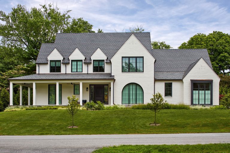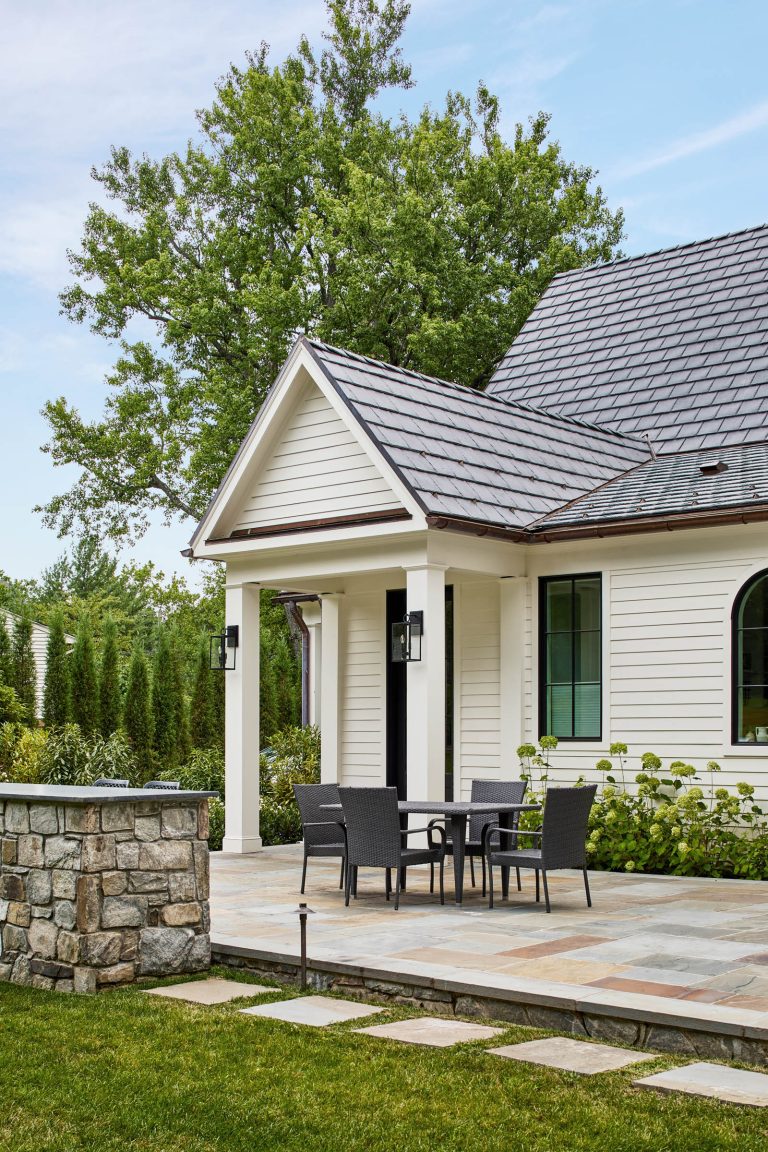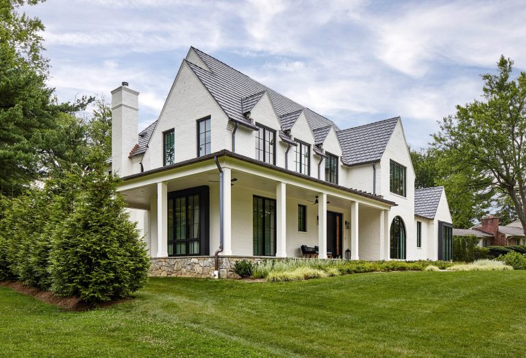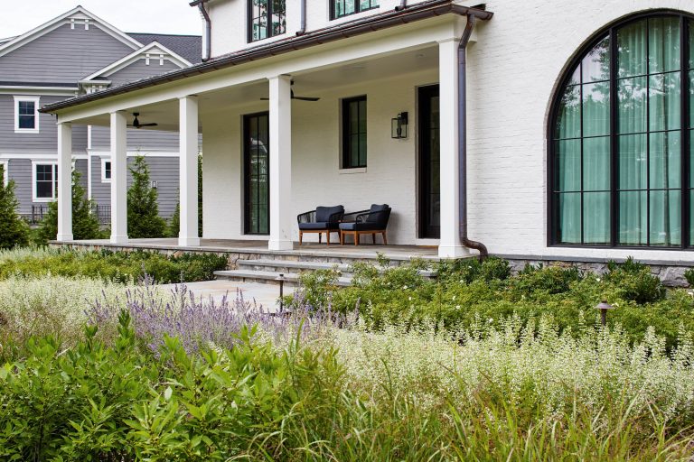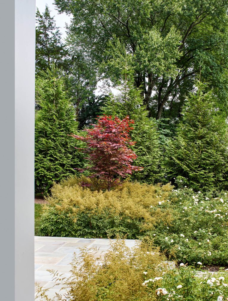 This new residence is sited in a well-established neighborhood in North Bethesda. The owners—a couple with young children—imagined multiple amenities for entertaining family and friends, which required a phased masterplan devised by Richardson & Associates. The first phase establishes dining areas, a large outdoor kitchen, gardens, lawns, the drive, and walkways. The front garden is somewhat unusual, with a beautiful rain garden built into the slope. The diverse planting palette of Ilex, weeping willow, Arborvitae, lilac, roses, hydrangeas, liriope, and cheery laurel ensure blooming colors and textures year-round.