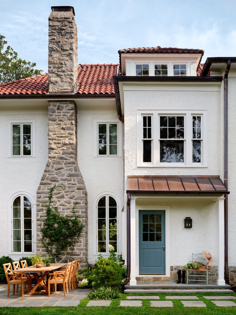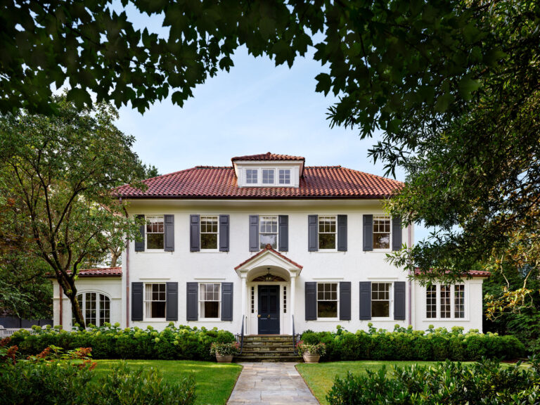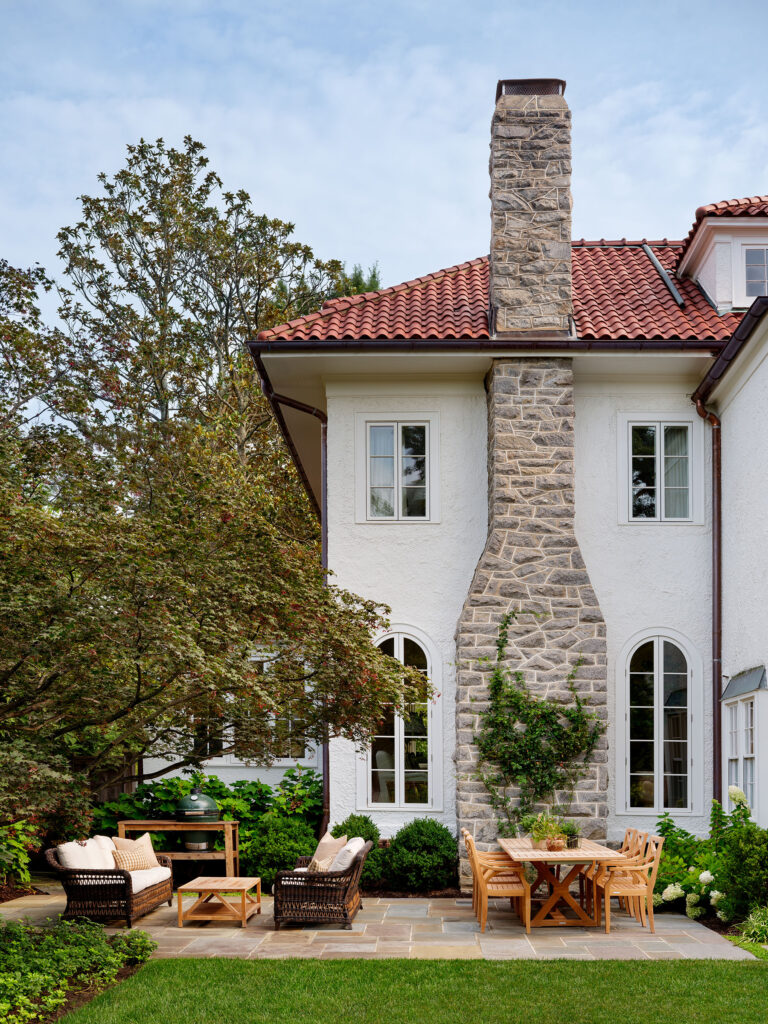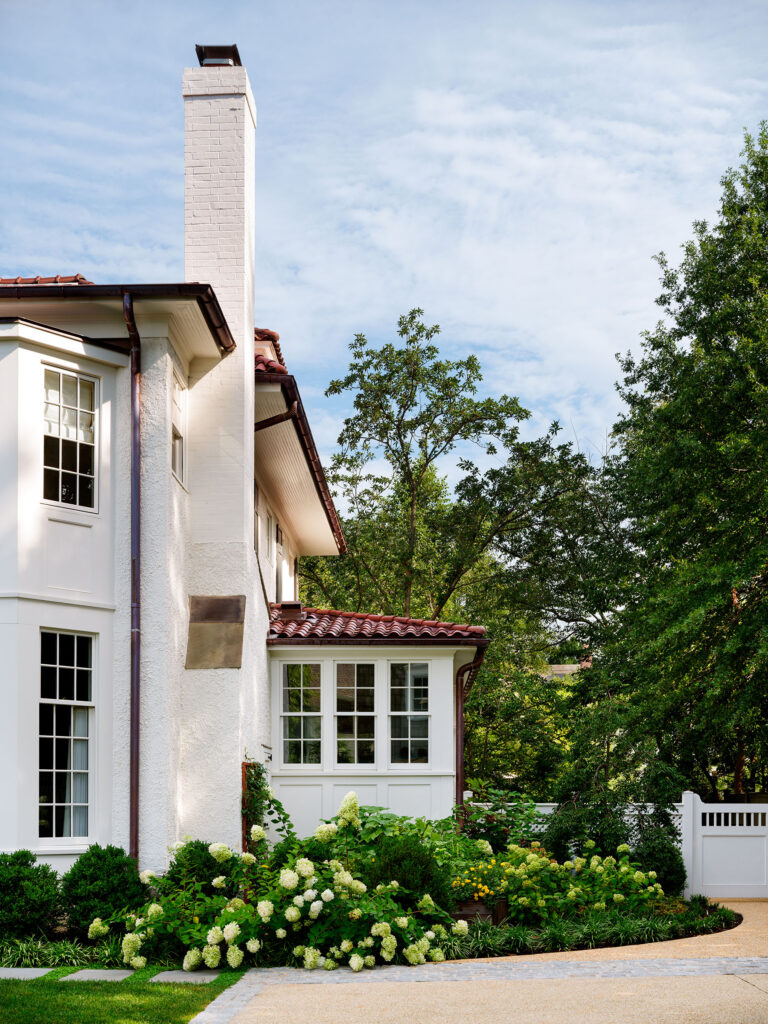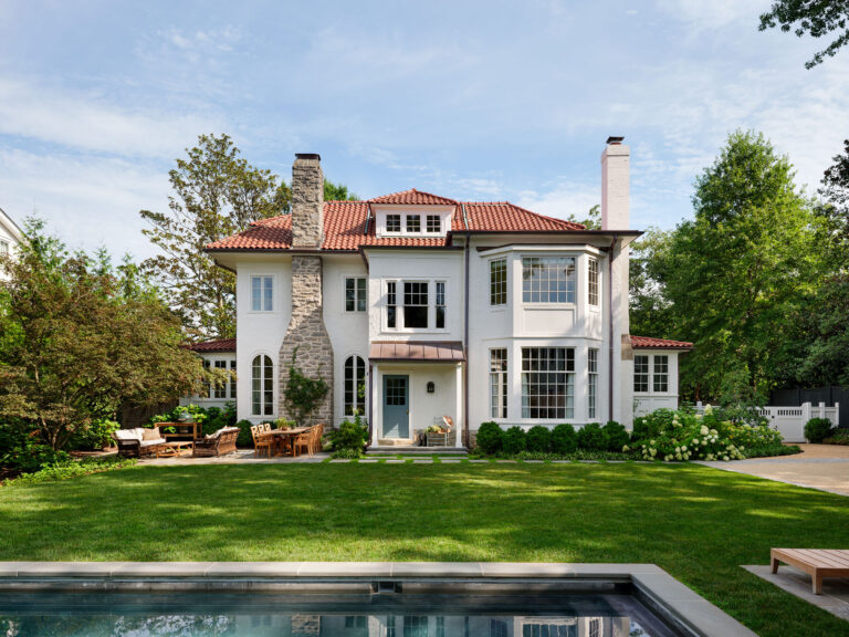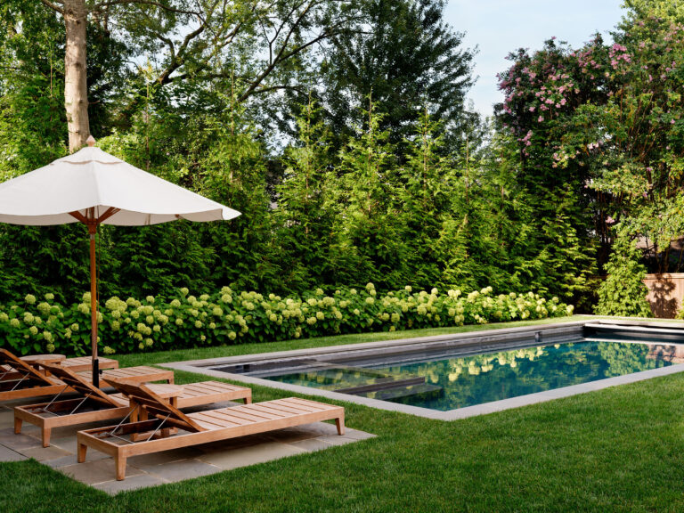 Inspired by their experiences at the Hamptons, the homeowners wanted to create a Hamptons-style garden sensibility at their home in Chevy Chase, Maryland. To create the luxe charm, open space, and neat symmetry the client desired, Richardson & Associates’ plan included a swimming pool surrounded by a lush carpet of grass. A minimal amount of stone tile paving is utilized for the chaise and entertaining areas to maximize the swath of lawn. The spare, yet elegant vision was achieved with complex engineering, which leveled the rear slope, and a limited palette of materials. Orderly boxwood sets the tone while hydrangea, liriope, hollies, and “New Dawn” roses soften the edges.