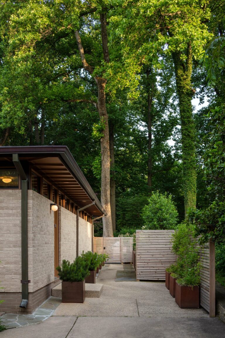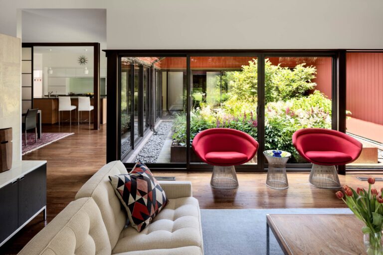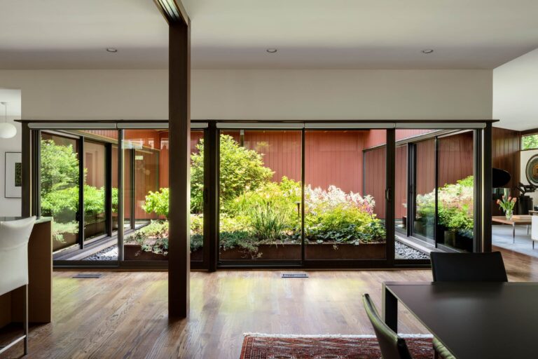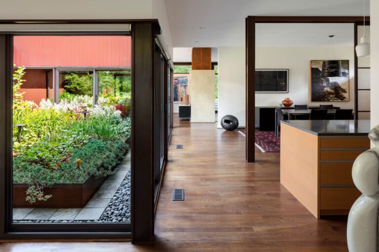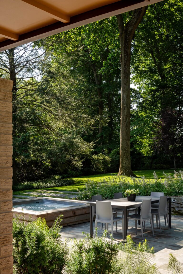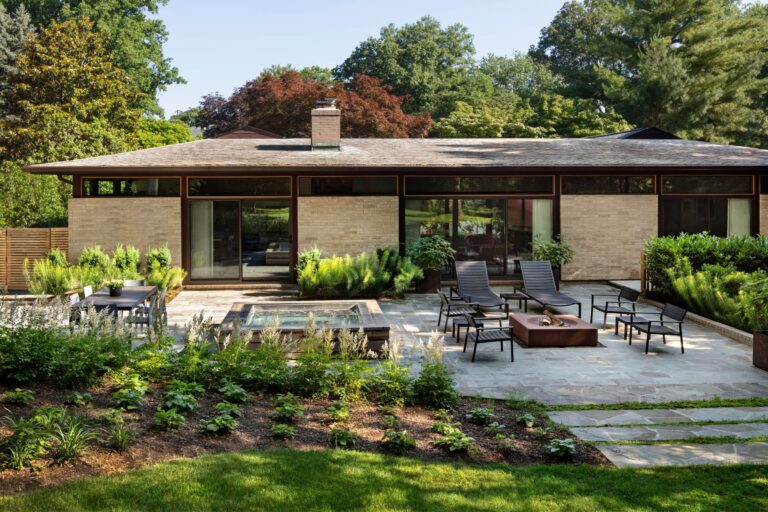 The Bauhaus-influenced design of this home was created by the husband’s architect father in the early 1960s. The owners renovated the structure in 2013 to become energy-efficient and compatible with twenty-first-century family living. A decade later, the landscape is altered to compliment the architecture, fulfill the owners’ desire to entertain outdoors, and draw their kids home now and then.