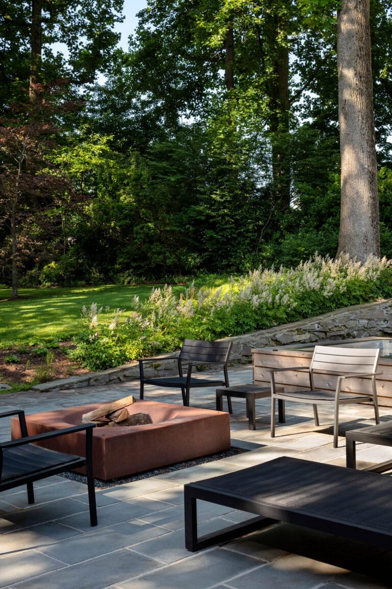 In the rear yard, the terrace is paved with liner, running bond flagstone with unique, irregular banding. A Corten stainless steel wood-burning firepit is set in bluestone gravel to prevent leaching. The central spa is stainless steel sheathed in high-grade cedar to provide a warm, natural material to the palette. Environmentally conscious, the outdoor kitchen runs on propane instead of gas. An existing stone wall was rebuilt to enclose the kitchen and dining area. Lawn steppers with joints of creeping ground cover make the transition from hardscape to grassy expanse. Additional plantings of liriope, anemone, and white astilbe Japonica guide the eye to existing Purple Beech, Dogwood, Cypress, Holly, and Magnolia trees further back in the yard. A second fire pit for the kids and an effective lighting plan make the entire setting glow.