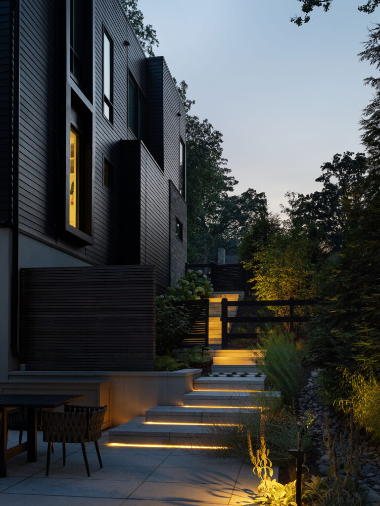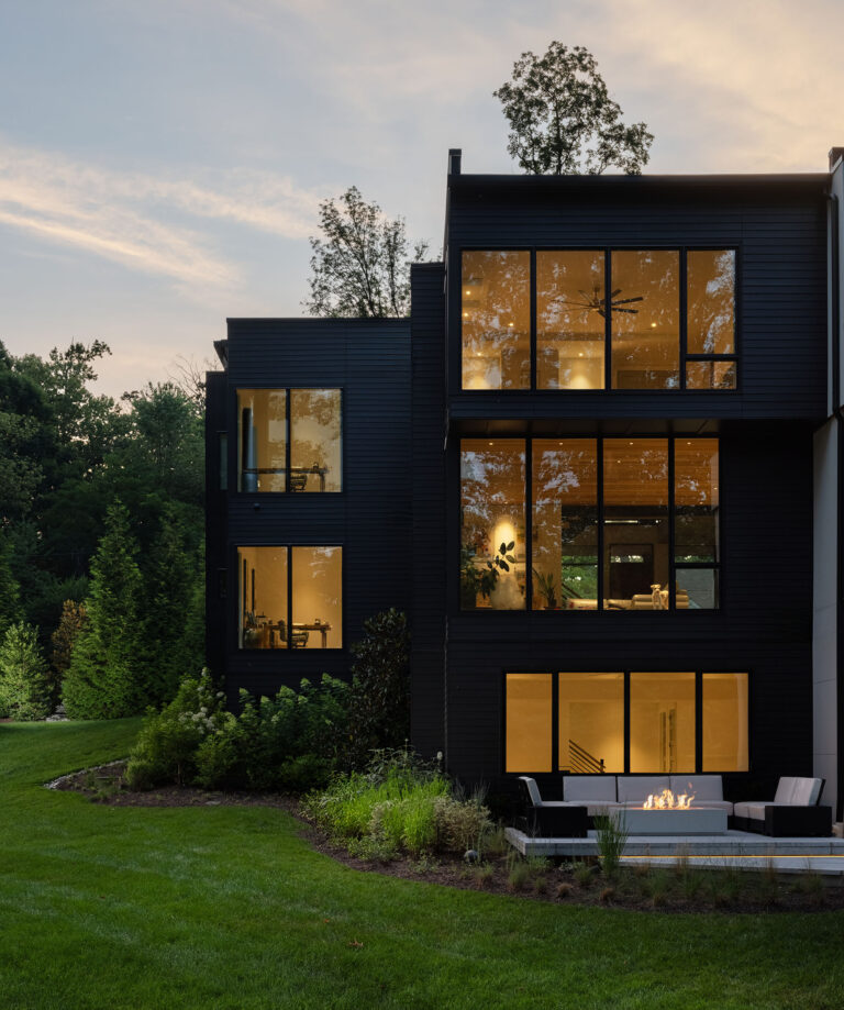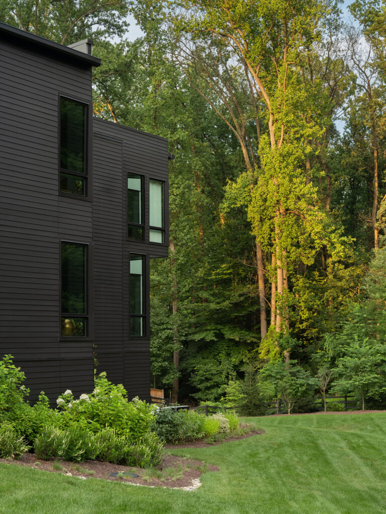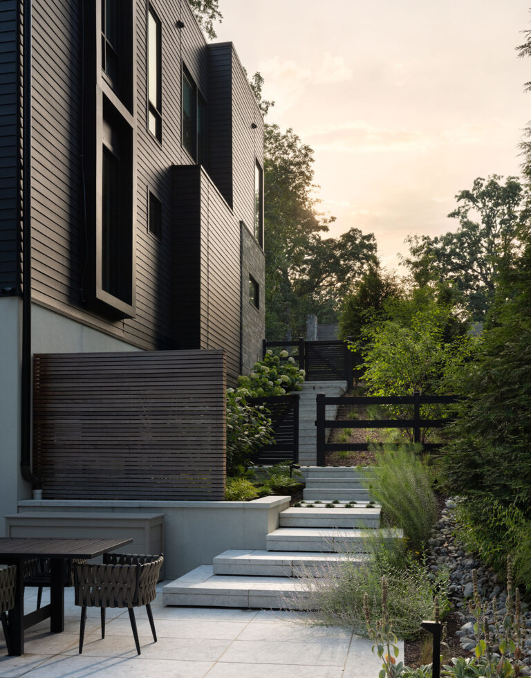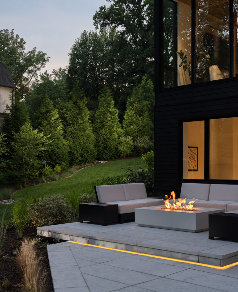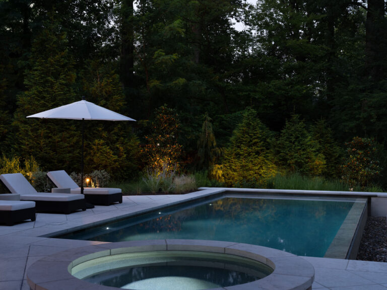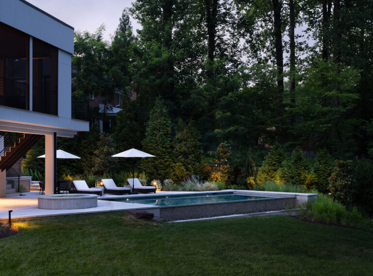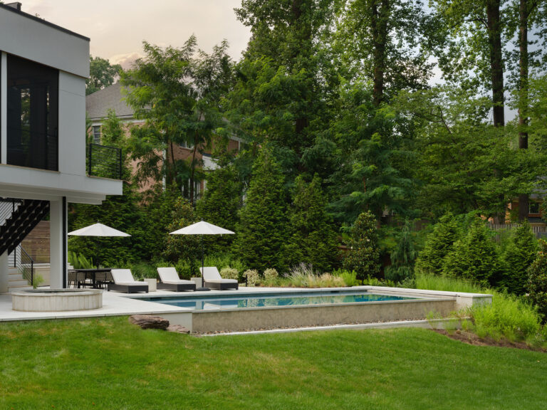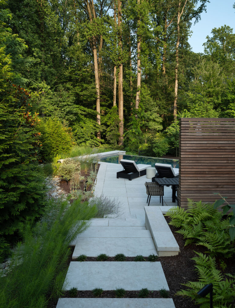 This site in McLean, Virginia, featured visually dramatic and robust architecture and a restrictive county stormwater easement. The clients’ program called for a pool at the rear of the house, which would have left very little space for the garden and yard if aligned orthogonally to the residence. By twisting the placement of the pool, Richardson & Associates not only worked with the easement but also gained space for a pleasing and unique experience. Broad platform stairs appear to float from the house to the pool deck, spa, and separate firepit terrace. A dog run cascades down alongside the stairs to the entry of the infinity pool, which catches the reflection of the trees. The raked finish on the marble veneer of the pool edge gives the water movement and adds texture to the raised vertical face of the spa. Curved planting beds and abundant hydrangeas temper the strong lines of the architecture.